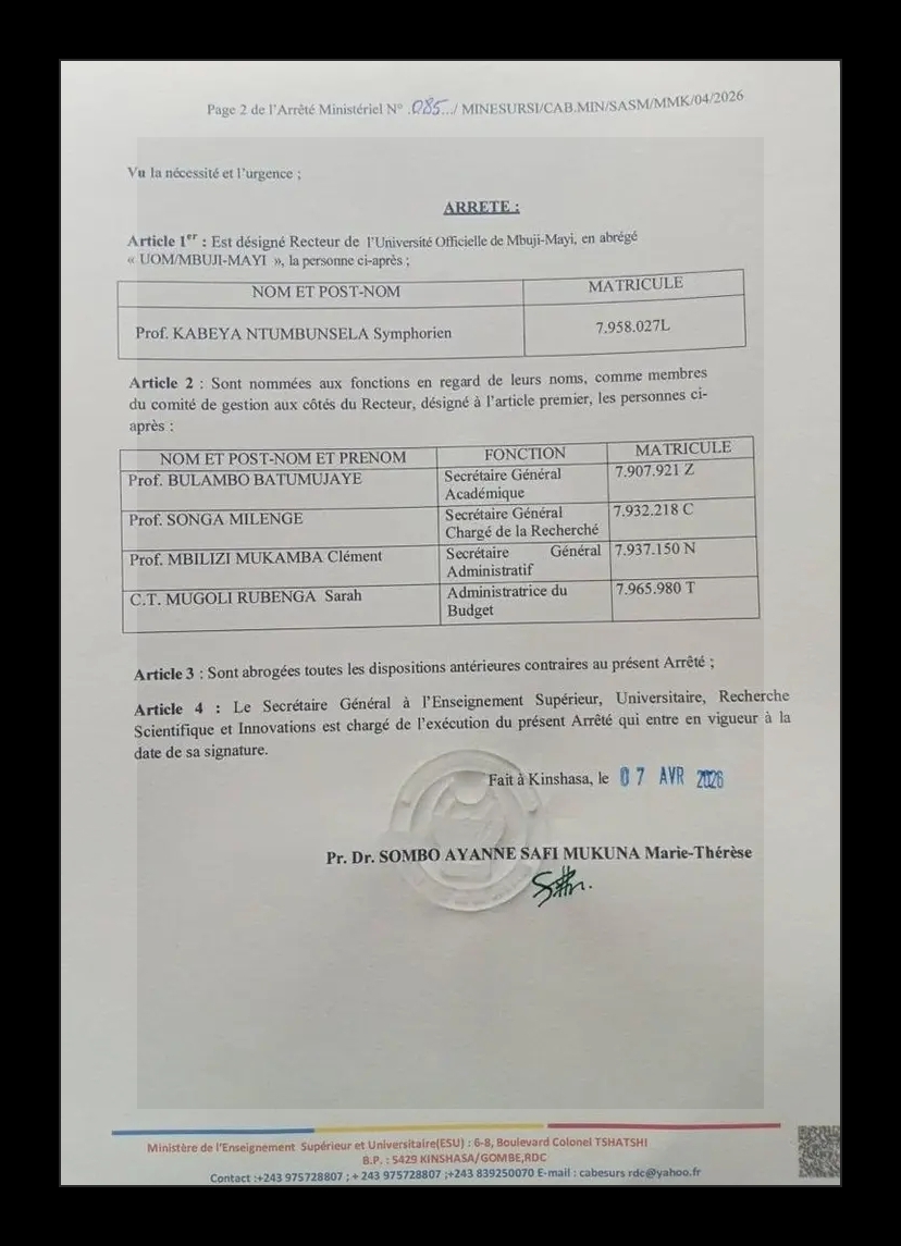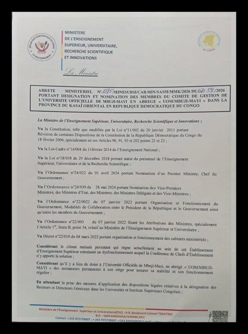 La ministre de l’Enseignement supérieur, universitaire, Recherche scientifique et Innovations, Marie-Thérèse Sombo Ayanne Safi Mukuna, a procédé à la désignation et à la nomination des membres du comité de gestion de l’Université officielle de Mbuji-Mayi (UOM), située dans la province du Kasaï Oriental. Cette décision est contenue dans un arrêté ministériel signé à Kinshasa et rendu public le 7 avril 2026.