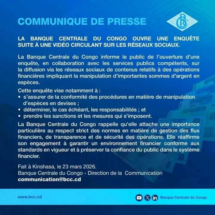 La Banque Centrale du Congo (BCC) a annoncé ce lundi 23 mars , l’ouverture d’une enquête contre les auteurs d’une vidéo présentant des manipulations d’importantes sommes d’argent et diffusée sur les réseaux sociaux .