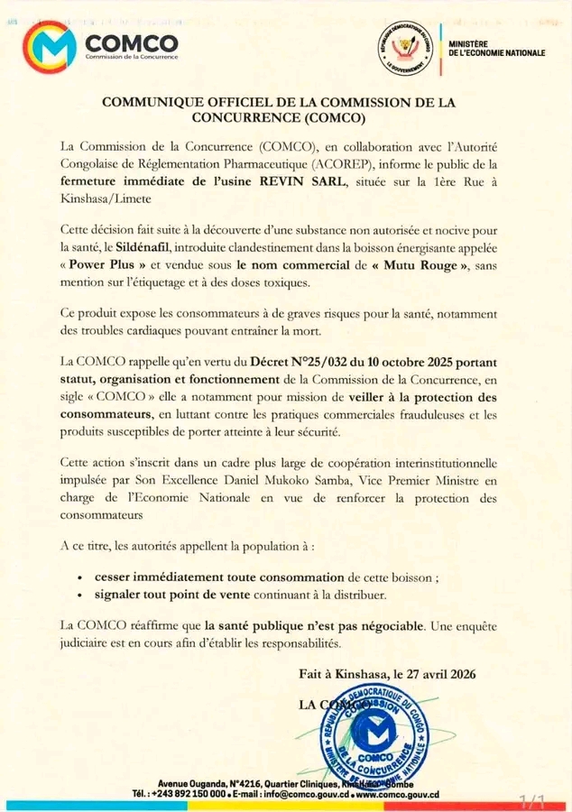 Dans un communiqué daté du 27 avril 2026 et consulté par la rédaction de Dysacnews.net, les autorités indiquent que du Sildénafil un composant médicamenteux a été introduit clandestinement dans la boisson « Power Plus », vendue sous l’appellation commerciale « Mutu Rouge », sans mention sur l’étiquetage et à des doses jugées toxiques.
